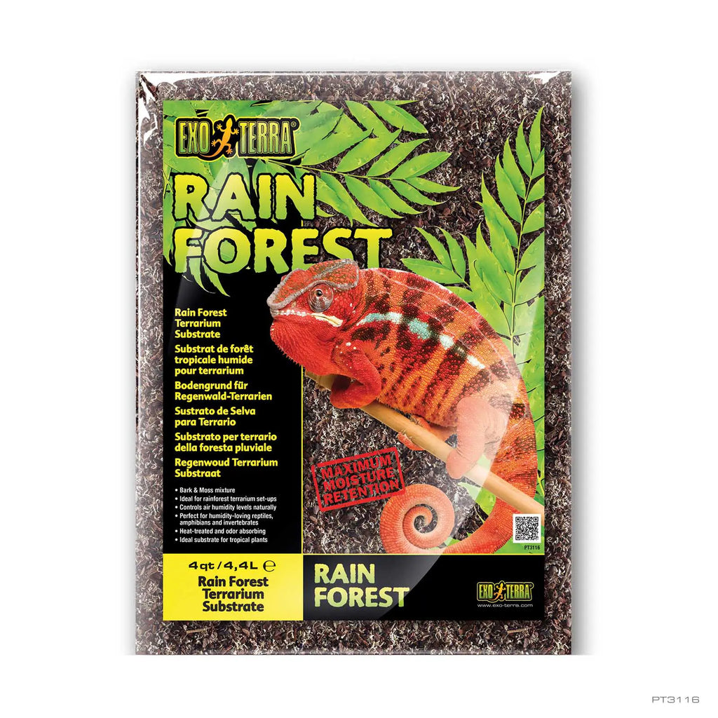 The Exo Terra® Rain Forest is a 100% natural, biodegradable reptile substrate mixture made from sustainable Maritime Pine & Sphagnum Moss. Rain Forest Terrarium Substrate is the ideal decorative substrate to create natural planted terrarium set-ups for humidity-loving reptiles, amphibians and invertebrates from tropical rainforest environments. The Rain Forest substrate regulates the terrarium’s humidity in a natural way by absorbing and slowly releasing moisture. Its hygroscopic properties is maximized by adding natural sphagnum moss to the mixture. Adequate air humidity levels aid in shedding and help prevent respiratory infections. The unique size and shape of the bark particles, in combination with natural sphagnum moss, allow frequent irrigation of your plants while still providing good aeration for healthy root growth. Exo Terra® Rain Forest is heat-treated to reduce bacterial contamination.